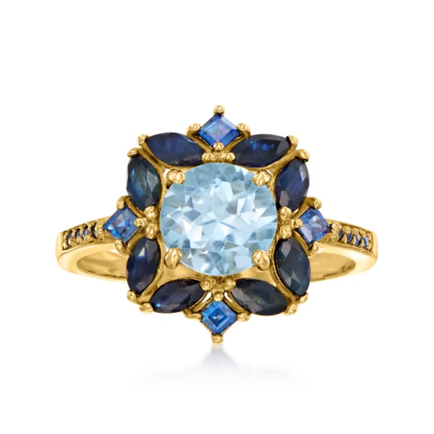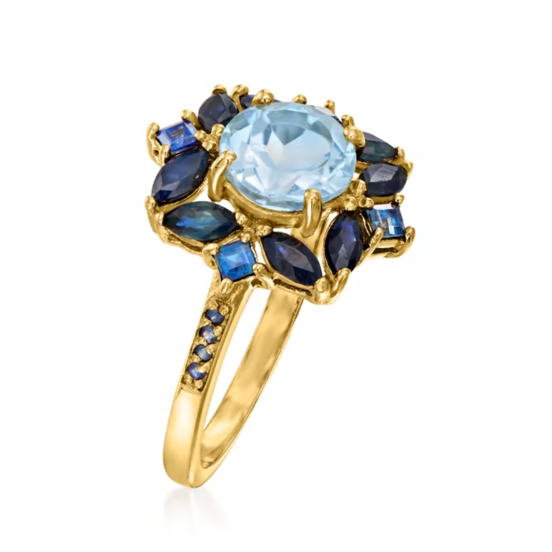 This striking piece showcases a polished 18kt yellow gold over sterling silver design, accented with a round 1.50 carats blue topaz, surrounded by marquise and multiple-cut sapphires totaling over 1 ct. t.w. The blend of the radiant blue topaz center stone with the harmonious sapphire accents creates a captivating visual effect, making it a sophisticated addition to any collection. The careful craftsmanship and exquisite gemstone arrangement reflect both elegance and a timeless appeal.