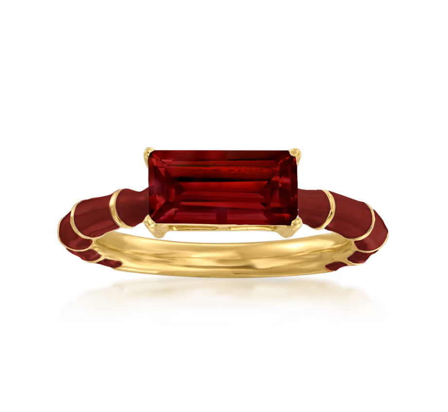 Elegantly designed, this polished piece features a lustrous 18kt yellow gold over sterling silver body, accented with vibrant enamel for a touch of modern sophistication. At its heart lies a striking baguette-cut garnet, weighing 1.70 carats and measuring 10x5 mm, imbuing the piece with a deep red radiance. The 3/16 inch width perfectly balances delicacy and presence, making it an exquisite accessory for those who appreciate the beauty of fine gemstones and the refined craftsmanship of gold and enamel work.