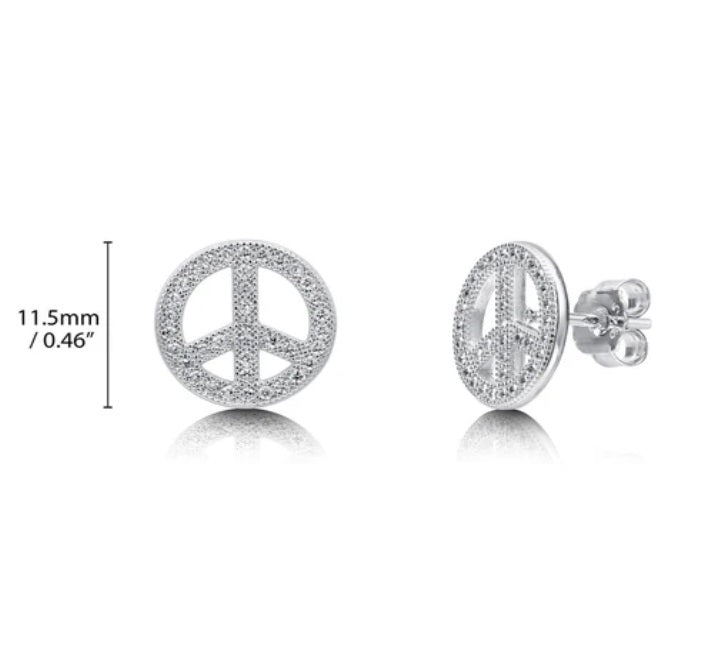 Add a touch of peace and sparkle to your wardrobe with these sterling silver peace sign stud earrings, featuring a total of 0.37 carats of round cubic zirconia stones in a micro pave setting. Measuring 0.46 inches in diameter, these earrings are elegantly designed with center posts and butterfly backs for secure wear. Crafted with nickel-free sterling silver and polished to perfection, they come packaged in a complimentary gift box for easy gifting or safe storage.