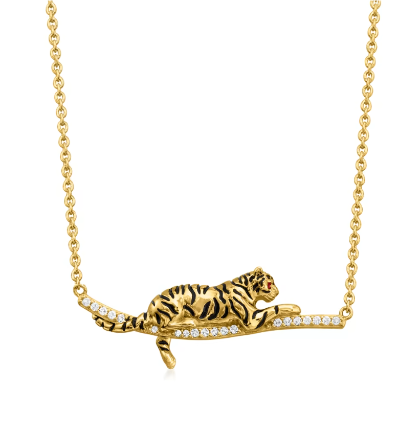 .10 ctw White Topaz and Black Enamel Tiger Bar Necklace with Ruby Accents in 18kt Gold Over Sterling. 18"