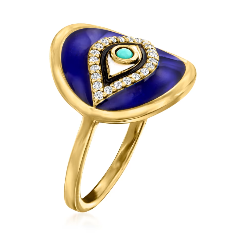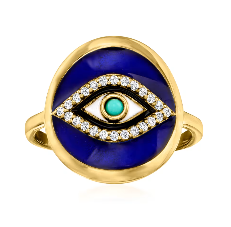 .10 ctw White Topaz and Multicolored Enamel Evil Eye Ring with Turquoise in 18kt Gold Over Sterling