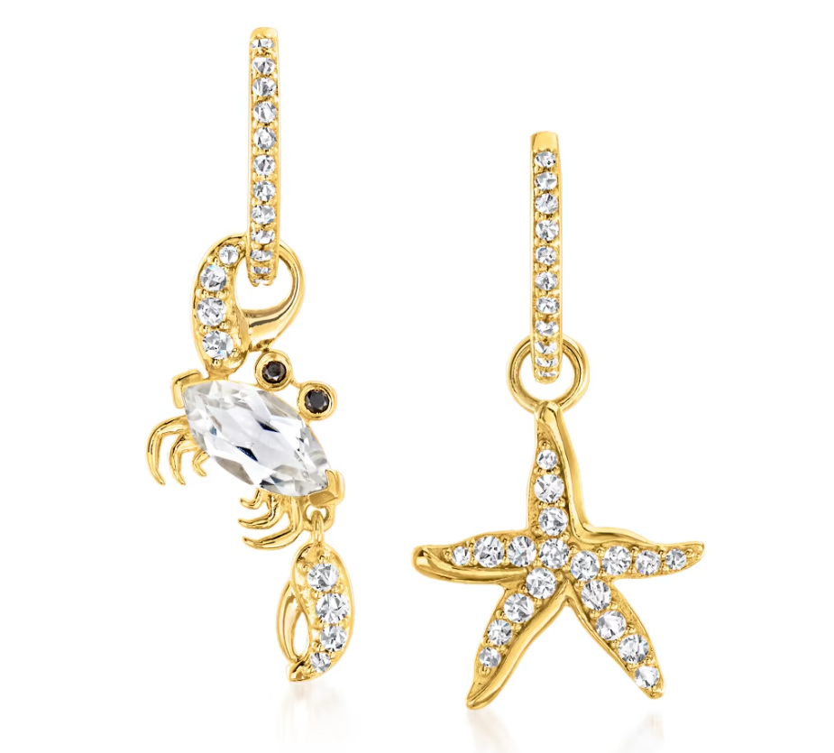 2.20 ctw White Topaz Starfish and Crab Mismatched Drop Earrings with Black Spinel Accents in 18kt Gold Over Sterling