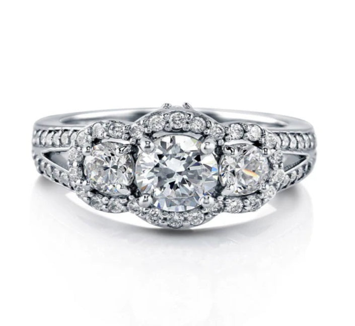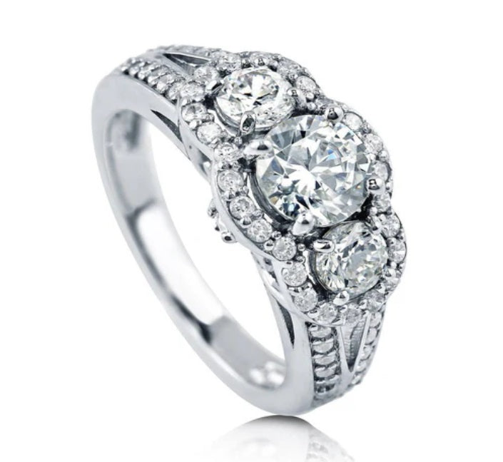 Adorn yourself with elegance wearing our sterling silver ring, featuring a premium 0.8 carat round cubic zirconia center stone in a 4-prong setting. Flanked by two 0.5 carat side stones and accented with sparkling CZ, this polished ring boasts timeless beauty and sophistication. Weighing 4.5 grams, it offers both style and comfort.
