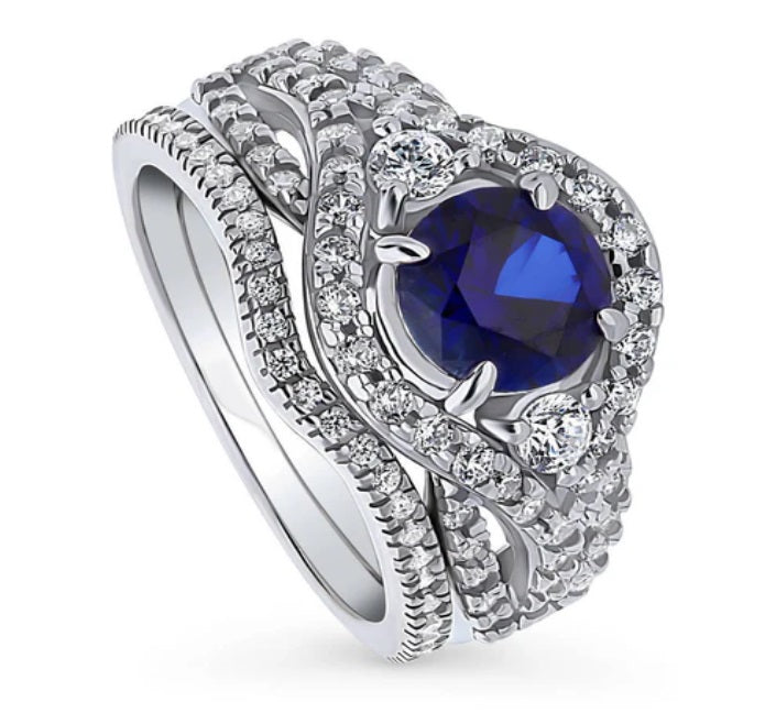 Introducing our opulent 925 Sterling Silver 2-Piece Woven 3-Stone Statement Ring and Wishbone Curved Half Eternity Ring Set, adorned with premium simulated blue sapphire cubic zirconia stones. The main stone boasts a stunning 1.25 carat round cut, set in a secure 4-prong setting, while accents totaling 0.94 ct.tw dazzle in micro pave, pave, and prong settings. Crafted with rhodium-plated sterling silver and stamped 925 for authenticity, this exquisite set features intricate design elements and a total band width of 3.5mm, making it a symbol of trust, loyalty, and wisdom. Each purchase includes a complimentary gift box, perfect for showcasing the deep blue elegance of this timeless ensemble.