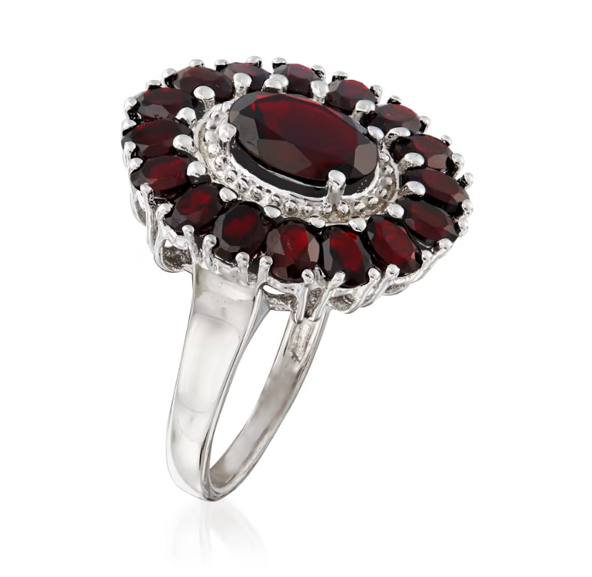 Complementing the central garnet are sixteen additional oval-cut garnets, each measuring 4x3 mm and collectively weighing 3.20 carats total weight. These gemstones are meticulously arranged to maximize their visual impact, adding depth and dimension to the piece. The burgundy color of these garnets creates a harmonious blend, enhancing the overall aesthetic appeal with their rich hues and elegant shapes.