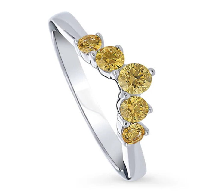 Crafted from sterling silver and rhodium plated for a lasting shine, this exquisite ring features a stunning V-shaped curved band adorned with premium quality round yellow cubic zirconia stones, totaling 0.51 carats in a pave setting. With a height of 3mm and a band width of 2.1mm, this wishbone chevron ring exudes brilliance and elegance, symbolizing the significant chapters of your life. Each ring comes with a complimentary gift box, making it perfect for special occasions or as a thoughtful gift.