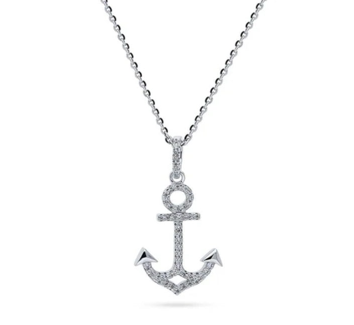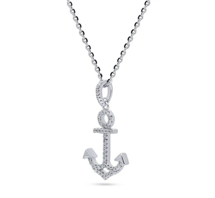 Embrace the serene vibes of summer with this anchor pendant necklace, featuring a stunning array of 48 round cubic zirconia stones set in a micro pave style. Crafted from rhodium-plated sterling silver and nickel-free, this piece ensures both durability and comfort. With its polished finish and spring ring clasp, it's the perfect accessory to carry the essence of breezy summer nights wherever you go.