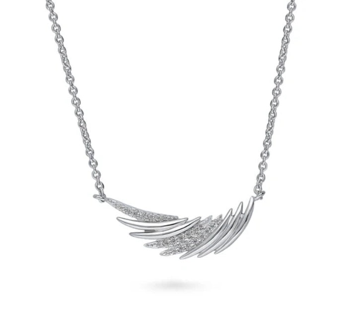 Adorn yourself with ethereal elegance with this deconstructed angel wing pendant necklace. Crafted from sterling silver with rhodium plating, it features 0.16 carats of round cubic zirconia stones in a delicate prong setting. The adjustable chain and lobster claw clasp ensure a comfortable and secure fit, making it an ideal accessory for any occasion.