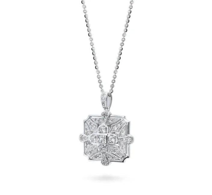 This sterling silver pendant necklace, plated with rhodium and nickel-free, exudes timeless elegance reminiscent of the Art Deco era. Adorned with a dazzling array of premium cubic zirconia stones in various cuts and settings, it radiates sophistication and charm. With meticulous craftsmanship and vintage-inspired design, this necklace is a stunning accessory that captures the allure of a bygone era.
