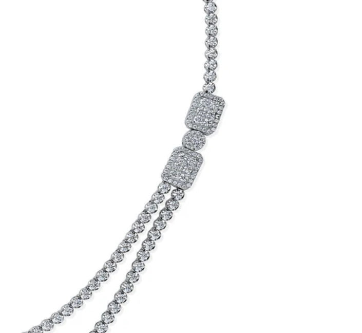 Elevate your style with this exquisite art deco tennis necklace, featuring a total of 9.46 carats of round cubic zirconia stones in a mix of pave and prong settings. Crafted from sterling silver with rhodium plating, this necklace boasts layers of brilliant sparkle, making it perfect for any special occasion. With a length of 17 inches, a width of 3.3mm, and a 2-inch drop, it's a statement piece that will dazzle onlookers.