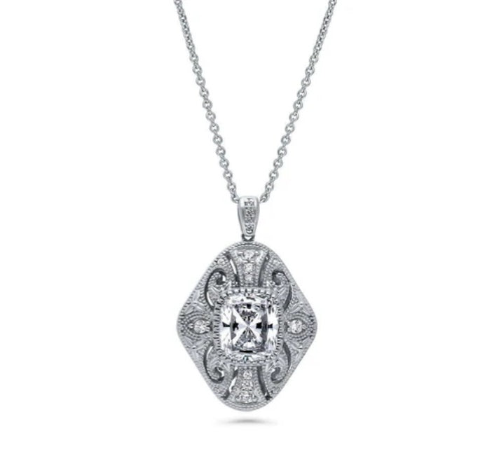 Indulge in vintage elegance with this art deco filigree milgrain pendant necklace. Crafted from rhodium-plated sterling silver, it features premium cushion and round cubic zirconia stones totaling 4.21 carats. The pendant, measuring 1.25" in length and 0.75" in width, hangs gracefully from an 18" rolo chain, secured with a lobster claw clasp. Elevate your style with this timeless piece, showcasing the coveted cushion cut alongside intricate milgrain detailing.