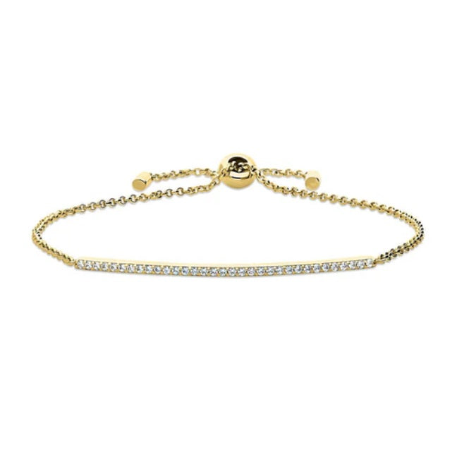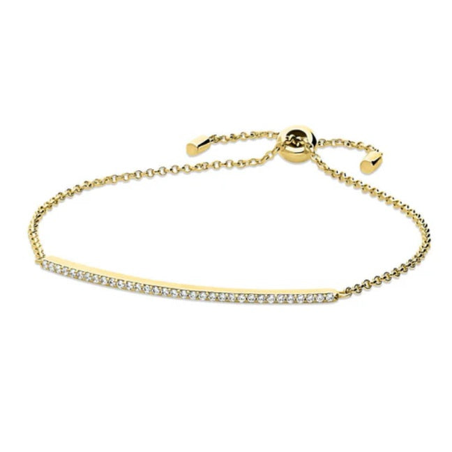 Introducing our Yellow Gold Flashed Adjustable Bar Chain Bracelet, adorned with premium round cubic zirconia stones totaling 0.33 carats. Crafted with stamped 925 sterling silver and featuring a chic micro pave setting, this bracelet exudes sophistication and timeless elegance. With a polished finish, an adjustable length from 3.5 to 9 inches, and a convenient pull tie clasp, it's the perfect accessory for any fashion enthusiast's collection.
