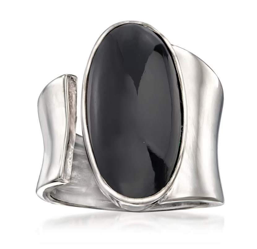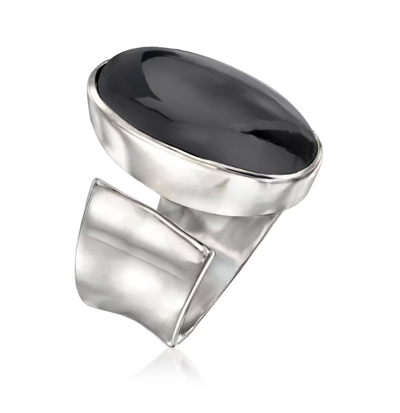 This stunning piece of jewelry showcases the sleek elegance of polished sterling silver, complemented by the deep, enigmatic beauty of a single black onyx gemstone. With a generous width of 3/4 inch, this piece is designed to make a bold statement, perfect for those who appreciate the timeless appeal of sterling silver paired with the classic sophistication of onyx.