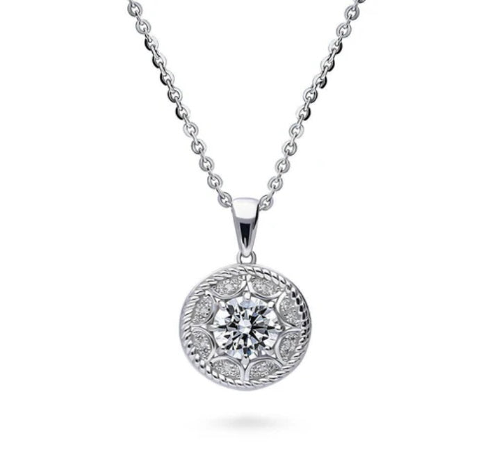 Elevate your style with this cable halo art deco pendant necklace, meticulously crafted from rhodium-plated sterling silver. The centerpiece features a premium 1.25 carat round cubic zirconia in an 8-prong setting, adorned with 0.16 carats of round CZ stones in a prong setting. With its ethereal sprinkle of lustrous embellishments surrounding the center stone, this necklace is sure to impress jewelry enthusiasts and admirers alike.