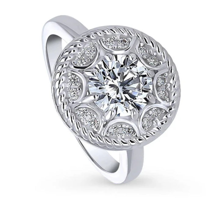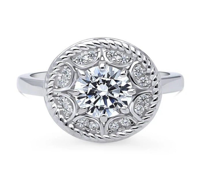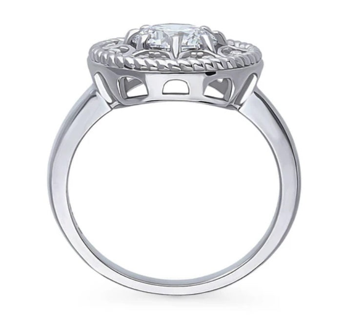 Elevate your style with this stunning art deco cable halo ring, crafted from rhodium-plated sterling silver, ensuring durability and brilliance while being nickel-free for comfort. The centerpiece boasts a premium quality 1.25 carat round cubic zirconia, delicately secured in an 8-prong setting, radiating timeless elegance and sophistication. Accentuating its allure are 0.16 ct. tw. of round CZ stones, nestled in a prong setting, adding a touch of sparkle to this exquisite piece. With a ring height of 6mm and a band width of 1.8mm, this ring exudes opulence and charm. Presented in a FREE gift box, it's the perfect accessory for any occasion.