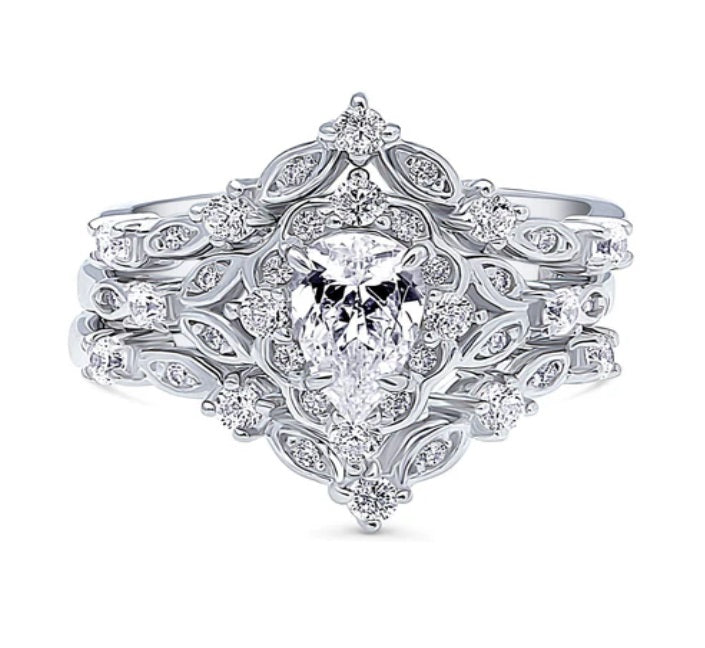 Indulge in vintage romance with our Sterling Silver Art Deco Halo Ring Set, featuring a stunning 0.8 carat pear cubic zirconia center stone accented by 0.63 carat total weight of round CZ stones. Crafted from rhodium-plated sterling silver stamped with 925, this 3-piece set boasts ornate details and a total width of 6.4mm. Each piece dazzles with multi-faceted brilliance, perfect for lovers of timeless glamour. Presented in a complimentary gift box, it's an ideal choice for any special occasion.