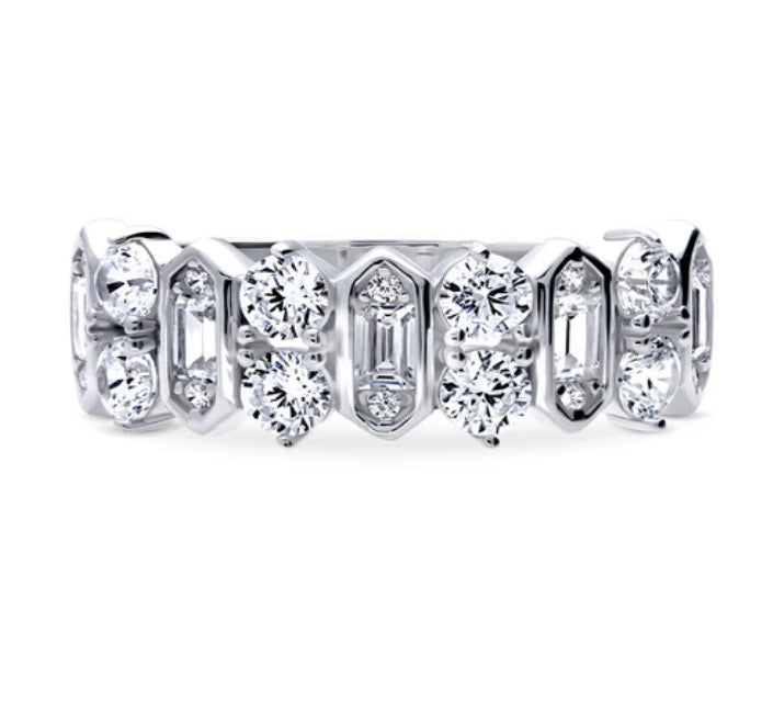 Elevate your style with our vintage-inspired wide band cluster ring, featuring a stunning combination of baguette and round cubic zirconia stones in an Art Deco design. This unique piece exudes sophistication and vintage charm, perfect for stacking or wearing alone. Indulge in timeless elegance with this exquisite ring.