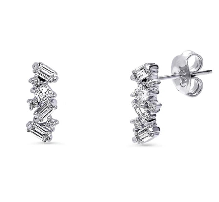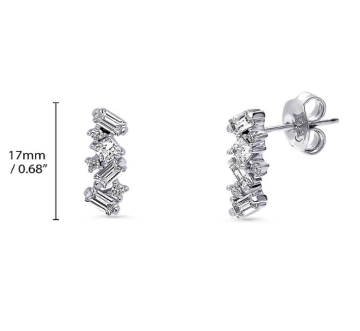 Imbued with timeless elegance, these sterling silver earrings are a testament to refined taste. With a rhodium-plated finish and stamped 925 authenticity, they exude sophistication. Featuring a captivating cluster of mixed-cut cubic zirconia stones, including baguette, princess, and round cuts, these earrings offer a mesmerizing interplay of light and dimension. Secured with edge posts and butterfly backs, they measure 0.68 inches in length and 0.27 inches in width, ensuring a perfect balance of style and comfort. Presented in a complimentary gift box, they make a stunning addition to any jewelry collection.