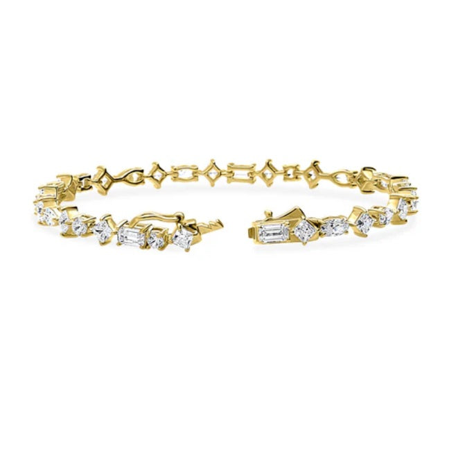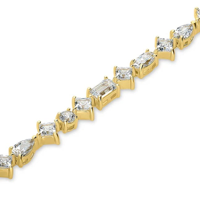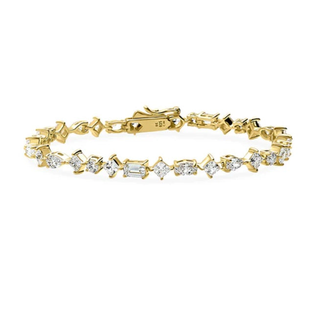 Elevate your elegance with our sterling silver cluster tennis bracelet, now featuring a yellow gold flashed finish for a touch of luxury. Adorned with an assortment of dazzling cubic zirconia stones totaling 6.52 to 7.49 carats, including emerald cut, oval, pear, princess, and round cuts, this bracelet exudes sophistication. With a secure box with tongue and safety clasp and a 5mm width, it seamlessly combines modernity with timeless charm. Presented in a FREE gift box, it's the perfect accessory for any occasion.