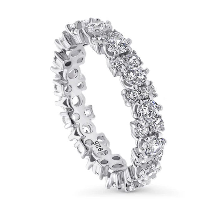 Elevate your style with our timeless eternity wedding band, boasting a stunning array of round-cut cubic zirconia stones set in a mix of classic 6-prong and pave settings. With its chic and stylish design, this ring is perfect for stacking or wearing alone to add a touch of elegance to any outfit.