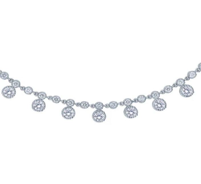 Elevate your style with the mesmerizing sparkle and regal design of this statement necklace. Crafted from brass and rhodium plated for enduring shine, the necklace features a stunning array of premium round cubic zirconia stones, totaling 20.21 carats, meticulously set in a crown setting. With its classic round cut stones, this necklace exudes timeless glamour and breathtaking brilliance, making it the perfect accessory for your special day.
