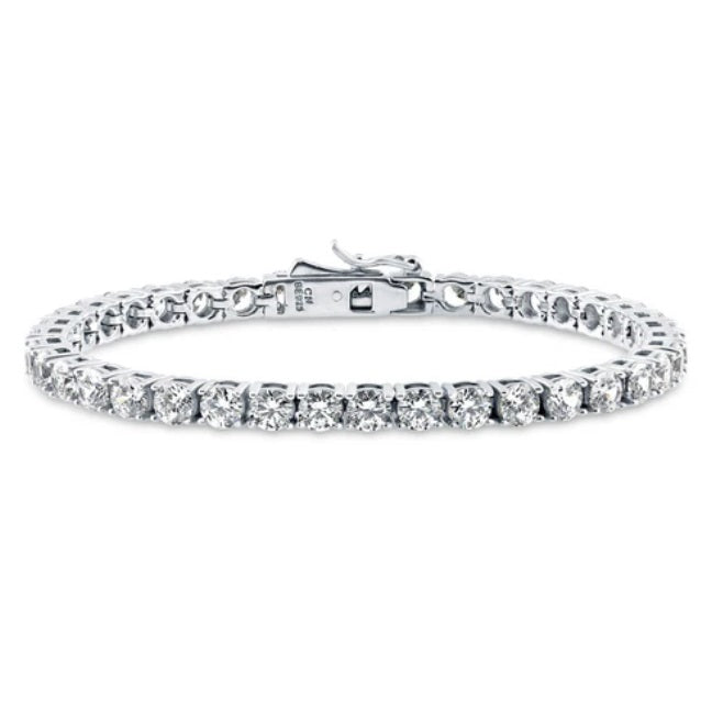 Elevate your ensemble with timeless elegance wearing our Sterling Silver Tennis Bracelet, meticulously crafted with rhodium plating for enduring brilliance. Adorned with premium round cubic zirconia stones totaling 10.5 carats (7-inch), 11.25 carats (7.5-inch), and 9.75 carats (6.5-inch), each stone delicately secured in a classic 4-prong setting. With a sleek 4mm width and a secure box with tongue and safety clasp, this bracelet is the epitome of sophistication, presented in a FREE gift box for added luxury.