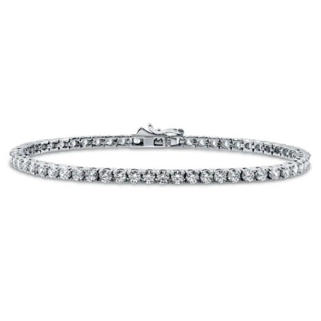 Elevate your style with our Sterling Silver Tennis Bracelet, featuring exquisite round cubic zirconia stones totaling 5.72 ct.tw (6.5-inch), 6.05 ct.tw (7-inch), and 6.49 ct.tw (7.5-inch), securely set in a timeless prong setting. With its sleek 3mm width and a dependable box with tongue and safety clasp, this bracelet is the epitome of classic sophistication, perfect for any outfit or occasion. Delivered in a complimentary gift box for a touch of luxury.