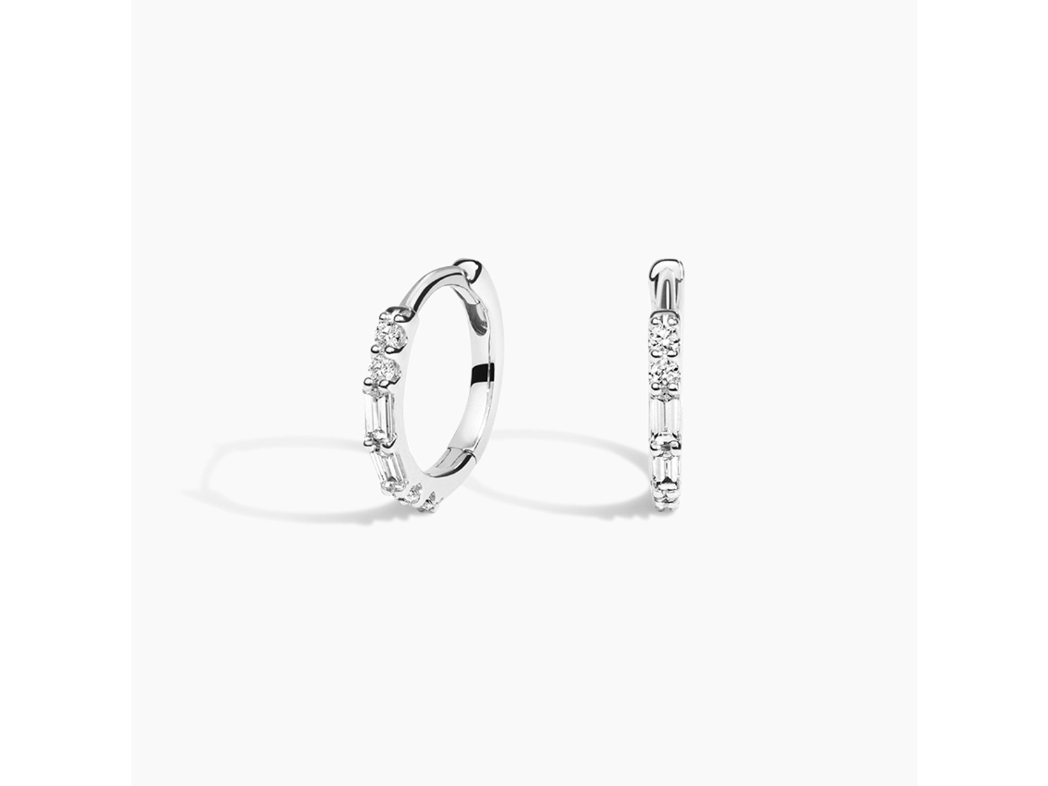 Elevate your style with these stunning Diamond Hoop Earrings. Crafted from 14K white gold, these fashionable hoops feature a captivating design with baguette-shaped and round diamonds expertly prong-set for a distinct and eye-catching allure. With a total carat weight of 1/8, these earrings are a Brilliant Pick, celebrated by Brilliant Earth designers and customers alike for their exceptional beauty and quality.