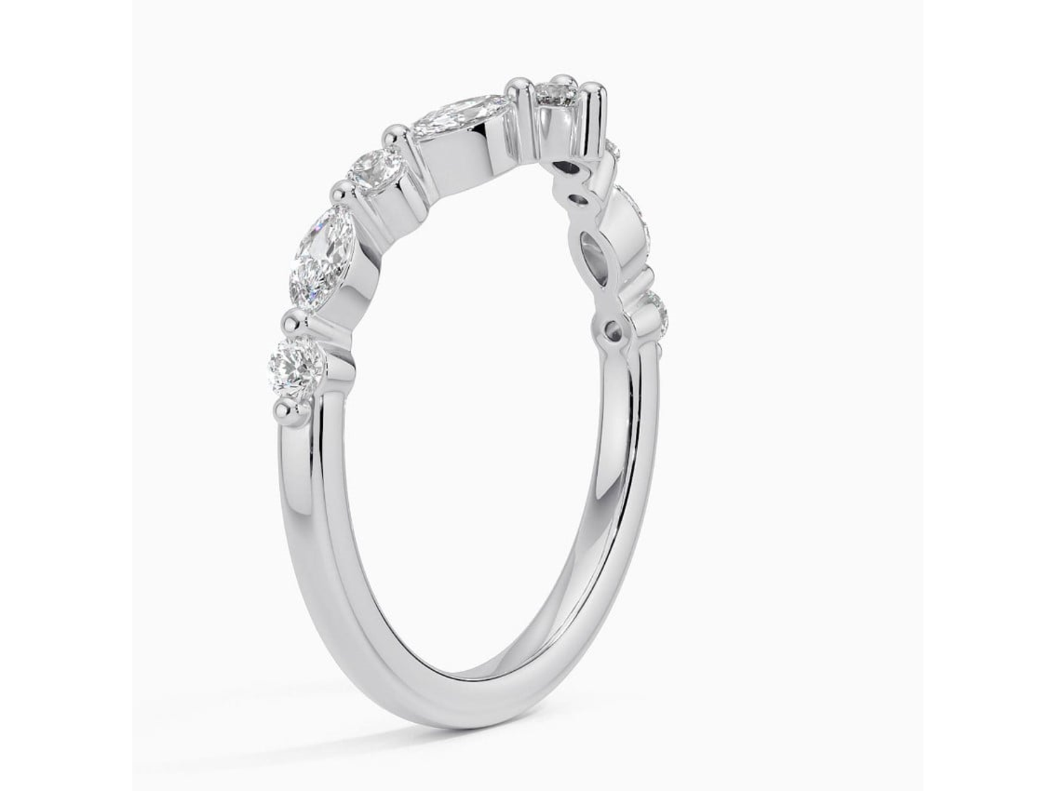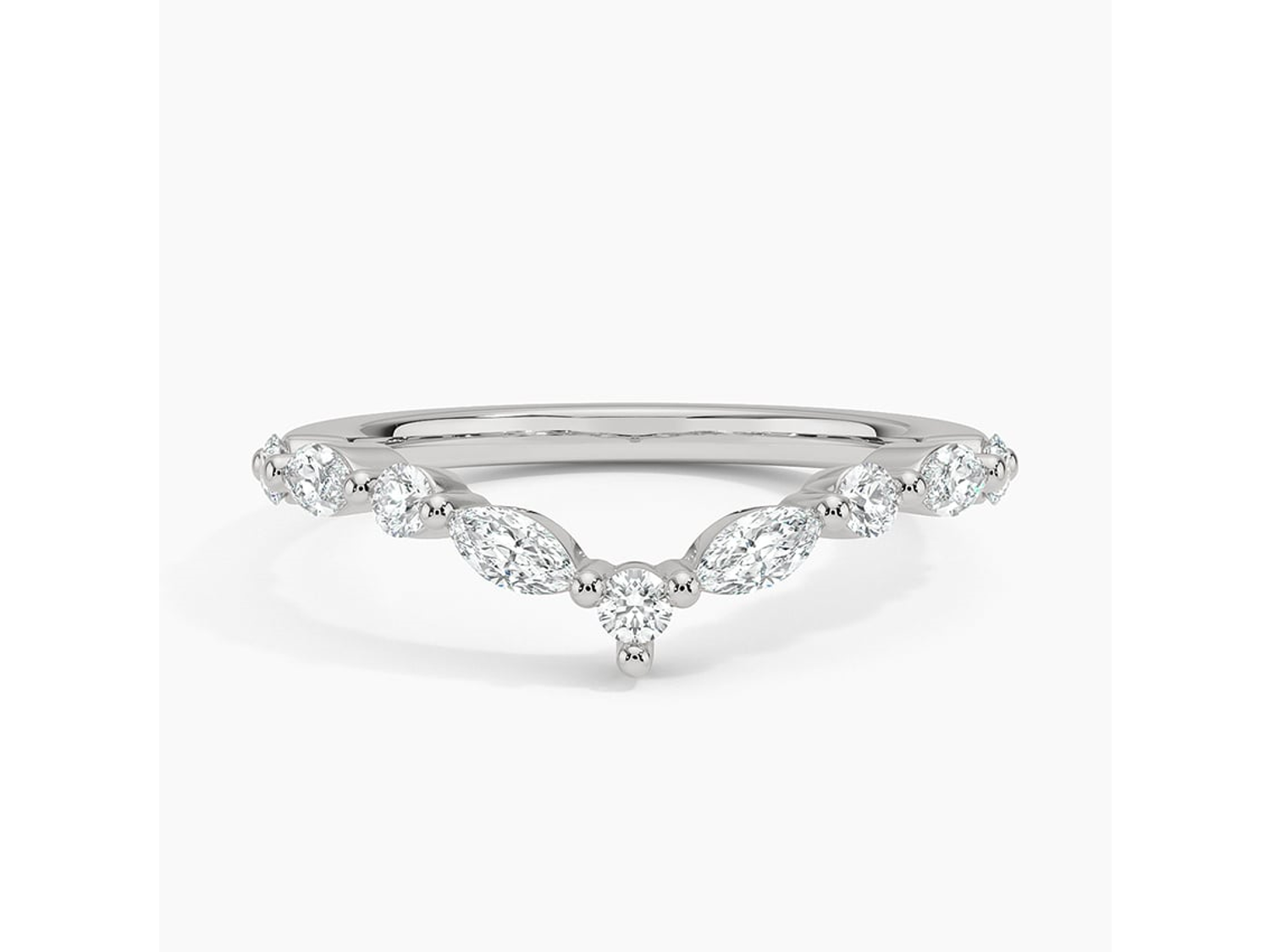 Elevate your style with the Dazzling Chevron Harmony 3/8 ctw Diamond Ring. Alternating round and marquise diamonds flow halfway down the band, creating a subtly curved chevron shape that exudes elegance. This stylish ring is versatile, perfect for wearing alone as a statement piece or paired with an engagement ring for added brilliance. With a total carat weight of 3/8, it's crafted to perfection and presented in a deluxe ring box for a touch of luxury.