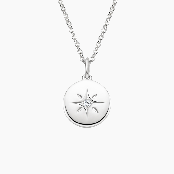 Illuminate your style with the North Star Diamond Pendant. This lovely pendant shines with the constant brightness of the North Star, featuring a star-set diamond nestled within a lustrous disc of precious silver. Radiate elegance and grace with this celestial-inspired piece that adds a touch of sparkle to any ensemble.