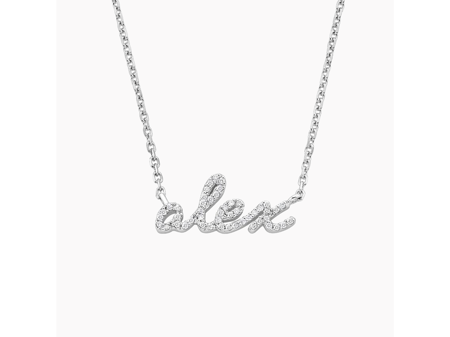 Personalize your style with our Script Diamond Name Necklace, where you can customize with your name, favorite place, or a meaningful word crafted in lustrous letters. Each necklace is unique, adorned with diamonds and available in chain lengths of 16, 17, or 18 inches, ensuring a perfect fit. Please note, all sales are final due to the personalized nature of this one-of-a-kind creation.