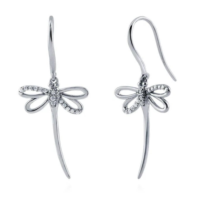 Embrace the whimsical allure of nature with these enchanting dragonfly dangle earrings. Crafted from sterling silver and rhodium plated for enduring brilliance, these earrings feature premium quality round cubic zirconia stones totaling 0.16 carats. The delicate pave setting enhances their sparkle, while the fish hook backs ensure comfortable wear. With a length of 1.5 inches and a width of 0.7 inches, these earrings make a charming addition to any ensemble. Complete with a free gift box, they're perfect for nature lovers and anyone who appreciates delicate beauty.
