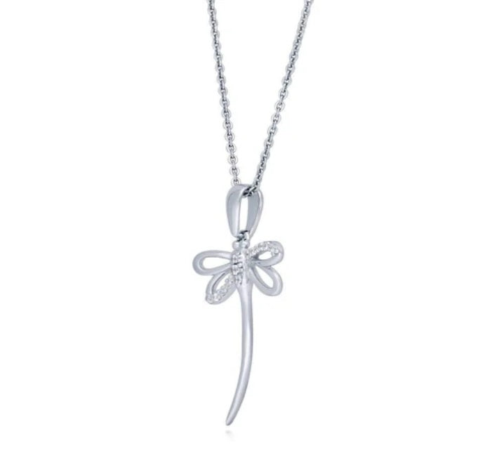 Elevate your style with this dainty dragonfly pendant necklace, crafted from sterling silver with a rhodium plated finish. Adorned with round cubic zirconia stones totaling 0.145 carats, the pendant exudes natural charm and elegance. Measuring 1.2 inches in length and 0.7 inches in width, it hangs delicately from an 18-inch rolo chain secured with a spring ring clasp.
