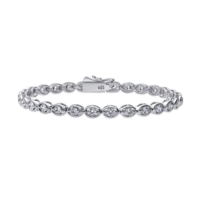Enhance your elegance with our sterling silver east-west tennis bracelet, featuring premium round cubic zirconia stones totaling 2.86 to 3.3 carats, each delicately set in a secure 2-prong setting. With its modern design and glamorous exuberance, this 5mm wide bracelet adds a touch of sophistication to any ensemble. Crafted with rhodium-plated sterling silver and complete with a box with tongue and safety clasp, it's the perfect accessory to elevate your sparkle. Plus, it comes with a FREE gift box for added convenience.
