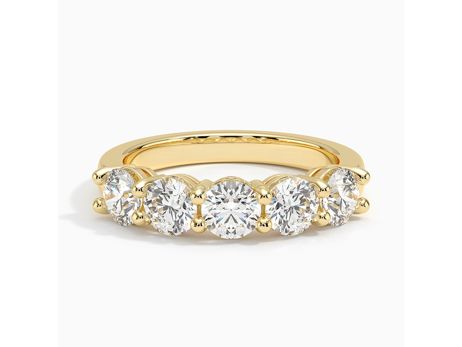 Elevate your elegance with our Round Five Stone Lab Diamond Ring (1 1/2 ct. tw.), crafted in luxurious 18K Yellow Gold. Featuring five round brilliant lab-grown diamonds delicately set in shared prongs, this classic band exudes timeless charm and sophistication. Perfect for weddings or anniversaries, this ring symbolizes enduring love and commitment, making it a cherished addition to any jewelry collection.