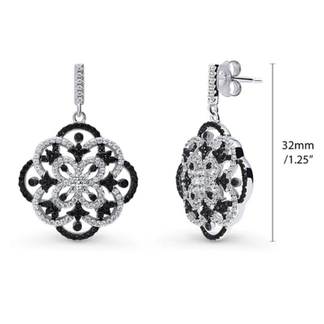 Make a bold statement with our Black and White Flower Dangle Earrings, crafted from stamped 925 sterling silver with a radiant rhodium plated finish for enduring elegance. Featuring premium quality round black cubic zirconia stones, totaling 1.86 carats and meticulously set in a striking pave setting, these earrings exude sophistication with their contrast of colors. Measuring 1.25" in length and 0.85" in width, with edge posts and butterfly backs for secure wear, these earrings are the perfect accessory to elevate any ensemble.