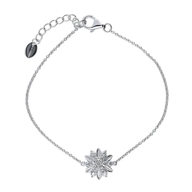 Enhance your grace with our Sterling Silver Flower Chain Bracelet, featuring delicate interlocking petals crafted from stamped 925 sterling silver and premium round cubic zirconia stones. With a matte finish and nickel-free rhodium plating, this bracelet exudes elegance and charm. Adorned with 13 pave-set stones totaling 0.39 carats, and secured with a lobster claw clasp, it's the perfect accessory for adding a touch of brilliance to any ensemble.