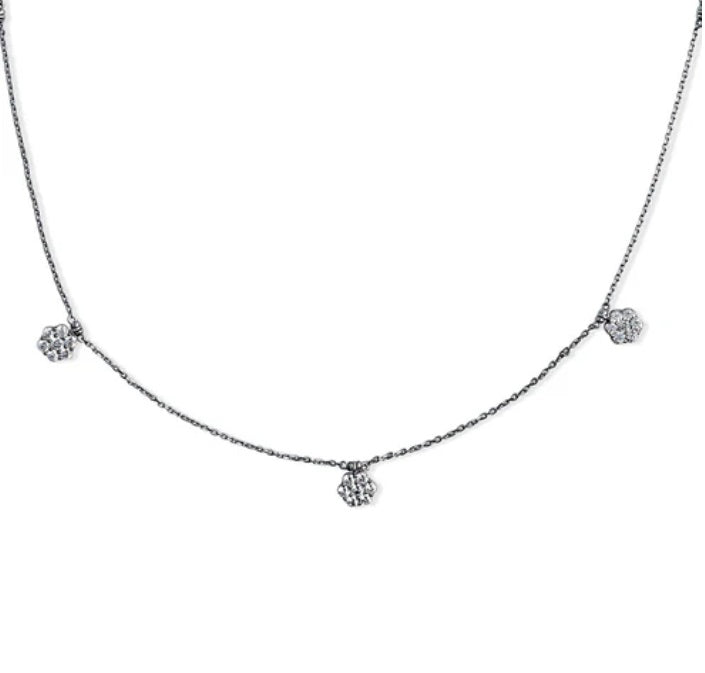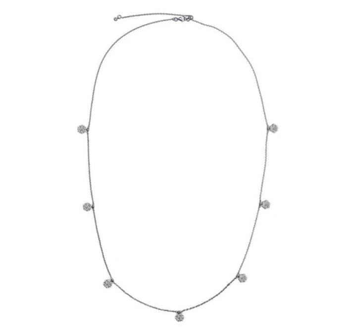 Elevate your style with this rhodium plated sterling silver flower station necklace, adorned with a total of 3.08 carats of round cubic zirconia stones in a dazzling pave setting. Featuring delicate floral charms along a 28-inch Rolo chain, this necklace is secured with a lobster claw clasp and comes packaged in a complimentary gift box, making it an ideal accessory for enhancing your everyday look.
