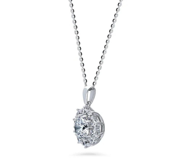 Revel in timeless glamour with this flower halo pendant necklace, featuring a stunning 2-carat round cubic zirconia stone in a prong setting, complemented by 1.1 carats of smaller stones in a pave setting. Crafted from rhodium-plated sterling silver, this necklace measures 0.8 inches in length and 0.57 inches in width, suspended from an 18-inch rolo chain secured with a lobster claw clasp.