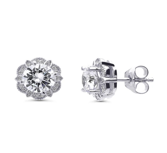 Flower Halo CZ Stud Earrings in Sterling Silver
