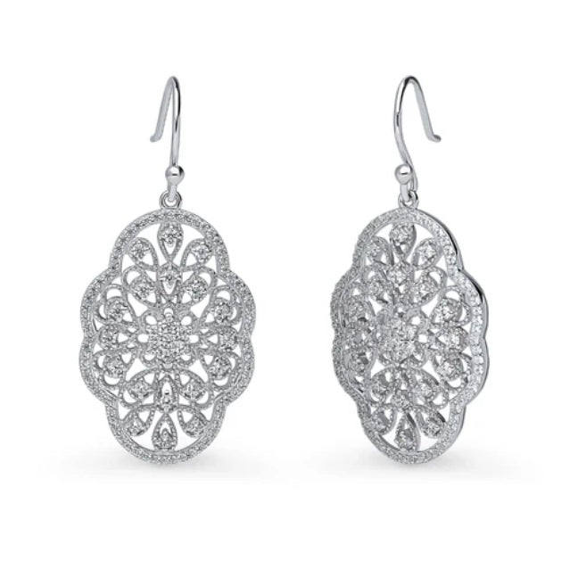 Introducing our Sterling Silver Flower Art Deco Filigree Pendant Earrings, featuring premium round cubic zirconia stones in a prong setting. Crafted with rhodium-plated sterling silver, these earrings boast a total weight of 0.75 carats, with each stone measuring 1.5mm. With an elegant vintage-inspired design, these earrings measure 1.6" in length and 0.72" in width, secured with fish hook backings. Make a statement with these luxe earrings, packaged in a complimentary gift box.