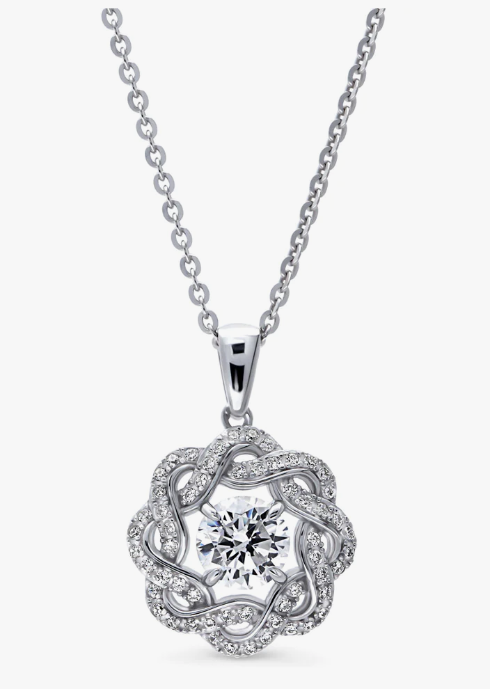 The pendant is adorned with a dazzling 6.5mm round cut cubic zirconia, set in a classic 4-prong setting as the focal point, surrounded by 56 smaller 1mm round cut stones, also in 4-prong settings, cumulatively weighing 1.28 ct.tw. The clear color of the cubic zirconia stones ensures a brilliant sparkle that captures the light beautifully, making this necklace a versatile accessory perfect for enhancing any outfit.