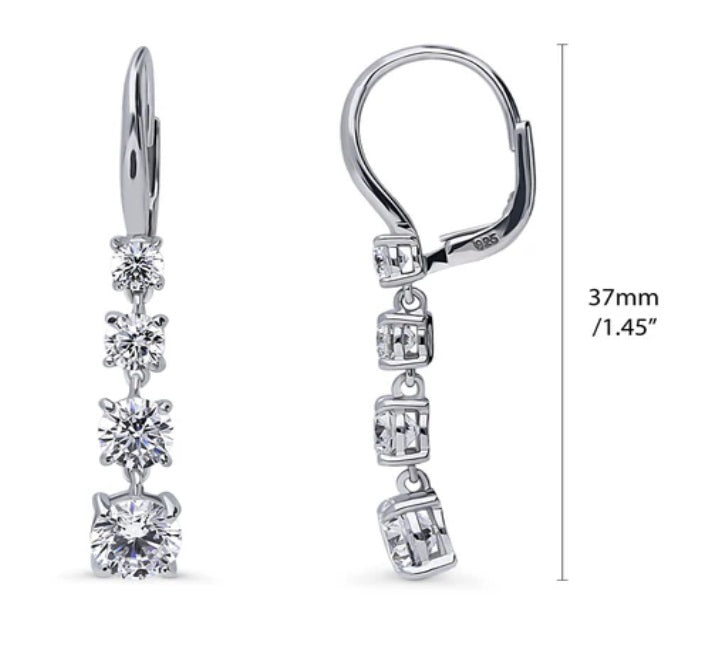 Fashioned from rhodium-plated sterling silver, these graduated chandelier earrings are adorned with a total of 3.34 carats of premium round cubic zirconia stones, arranged in a prong setting. Delicate and shimmering, these earrings measure 1.45 inches in length and 0.23 inches in width, showcasing a cascading design that adds a touch of elegance to any ensemble. The leverbacks ensure secure wear, while the polished finish enhances their allure. Presented in a complimentary gift box, these earrings are a timeless embodiment of glamour and versatility.