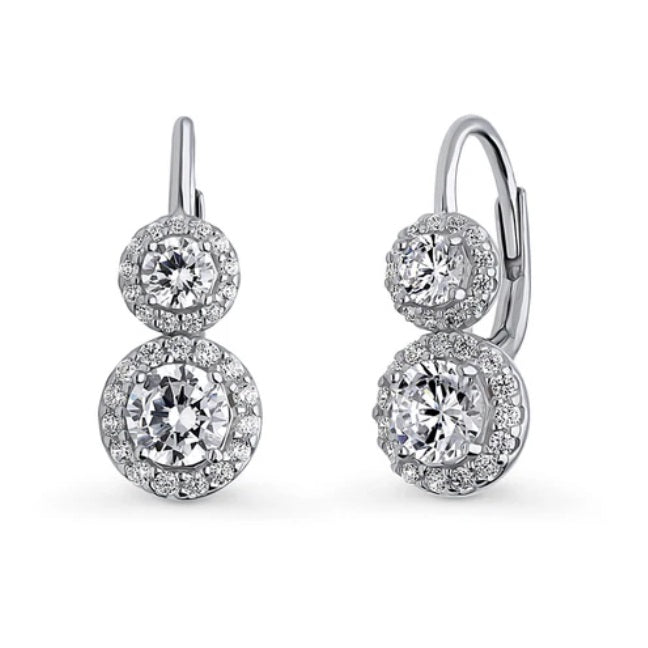 Halo 2-Stone Round CZ Leverback Dangle Earrings in Sterling Silver