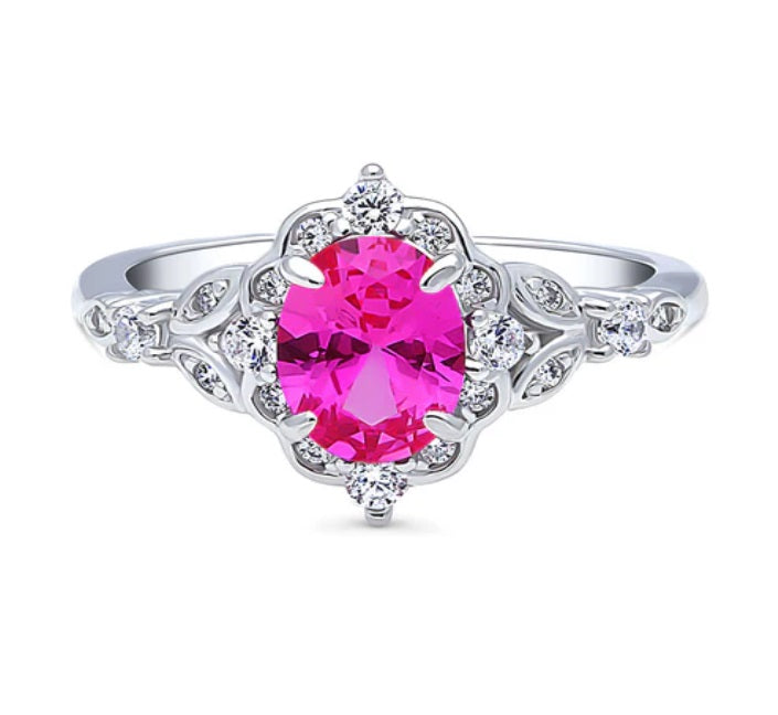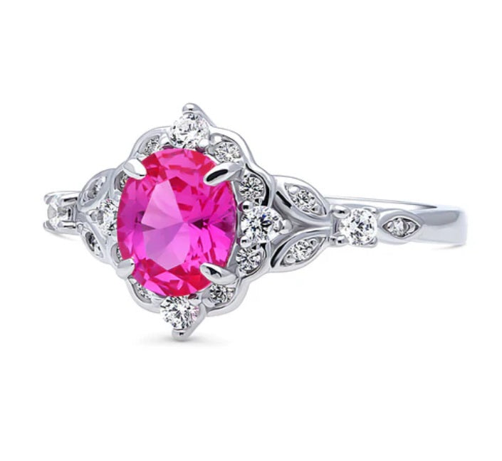 Halo Art Deco Pink Oval CZ Ring in Sterling Silver