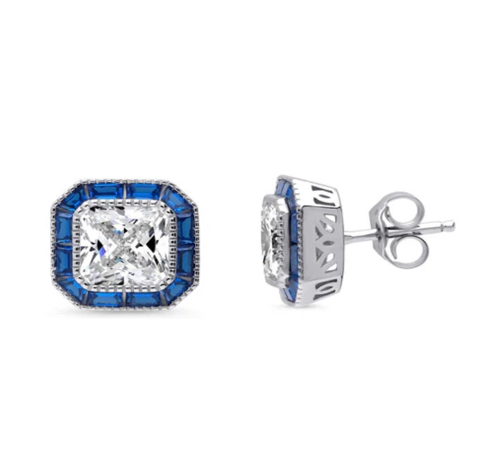Elevate your style with these royal halo milgrain stud earrings, featuring premium princess-cut cubic zirconia stones in a milgrain bezel setting. Accented with tapered baguette CZ, these earrings pay homage to 1920s-30s Art Deco charm, embodying the essence of a bygone era with their classic design.