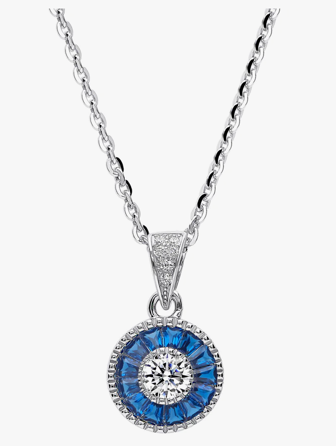 Adorned with a central 4mm round cut cubic zirconia in a milgrain bezel setting, alongside 13 sapphire color tapered baguette cut stones and 6 additional 1mm round cut stones in clear color, this necklace boasts a total carat weight of 0.608 ct.tw. The contrasting colors and shapes of the stones, set in milgrain bezel and prong settings, offer a dazzling play of light and elegance.