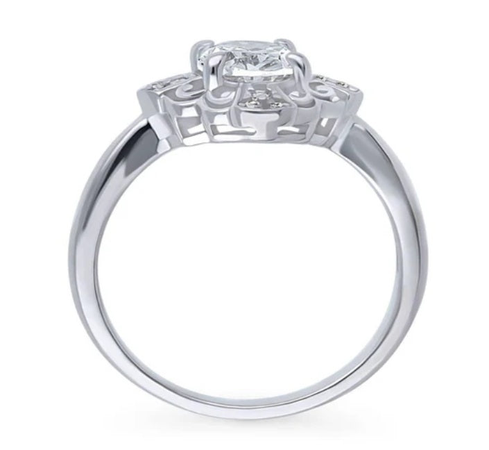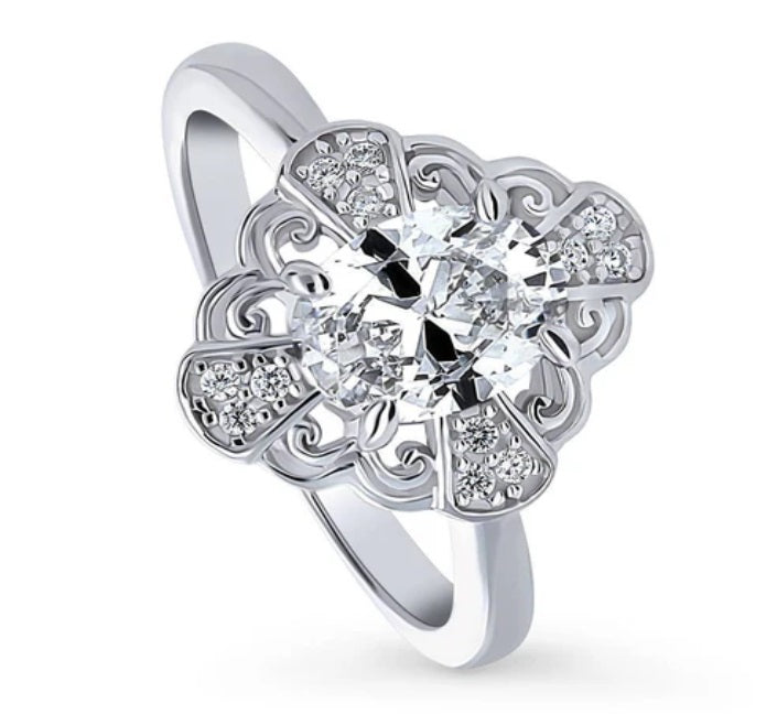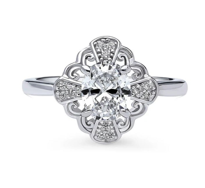 Indulge in the timeless elegance of this Art Deco-Style halo flower ring, meticulously crafted from sterling silver with rhodium plating for lasting brilliance. The centerpiece features a premium quality 1.2 carat oval cubic zirconia, measuring 8mm x 6mm, delicately held in a secure 4-prong setting. Accentuated with 0.06 ct. tw. round CZ, this ring measures 5mm in height with a slender band width of 1.8mm, exuding sophistication in every detail. Packaged in a FREE gift box, this ring is a must-have for vintage-style enthusiasts.
