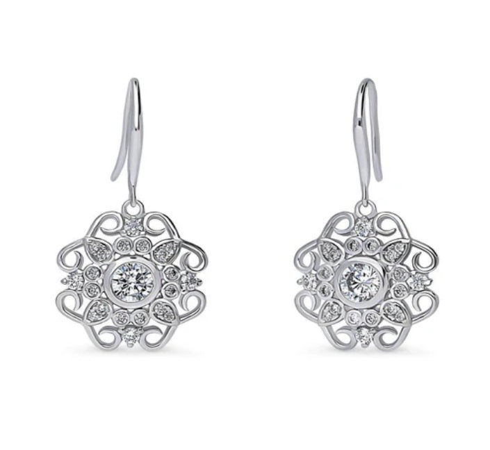 Embrace vintage glamour with our Art Deco-Style Halo Flower Dangle Earrings, featuring dazzling round cubic zirconia stones in a bezel setting, accented with intricate details in bezel and prong settings. With a total weight of 0.9 carats for the main stones and 0.52 carats for accents, these earrings exude timeless elegance. Crafted from rhodium-plated sterling silver and equipped with fish hooks, they measure 1.2 inches in length and 0.6 inches in width, making them a stunning addition to any jewelry collection. Packaged in a complimentary gift box, they're perfect for gifting or adding a touch of vintage flair to your ensemble.