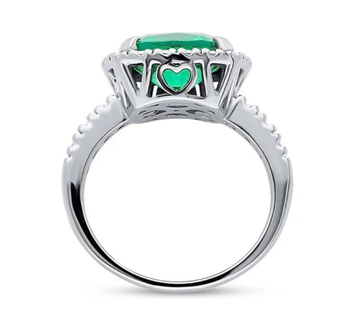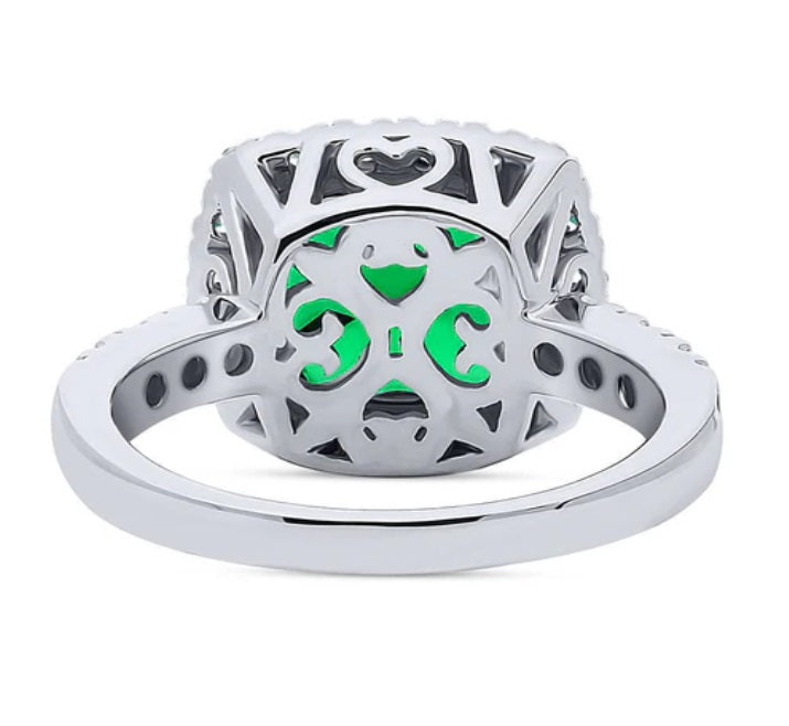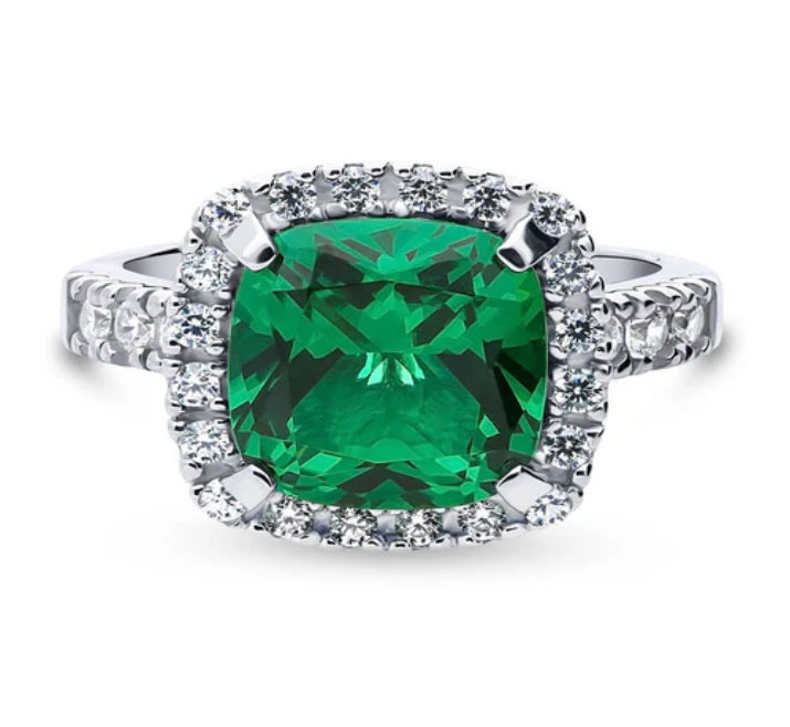 This sterling silver halo ring features a stunning 5.6-carat cushion green cubic zirconia, accented with 0.48 ct. tw. round CZ stones. With its classic design and timeless hue, this ring exudes elegance and sophistication, making it a statement piece for any occasion. The cushion cut, known for its distinctive shape and brilliant facets, adds a touch of refinement to your look, while the green color symbolizes growth, harmony, and strength.
